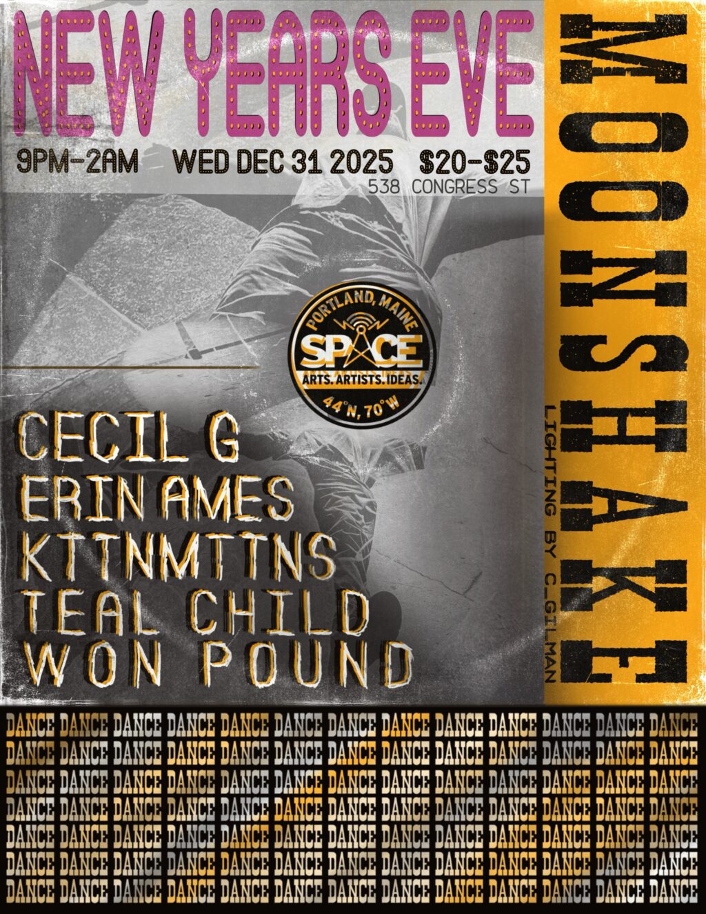 SPACE rings in the new year with the Moonshake crew. Immersive light show by C. Gilman, custom sound system, and proper dance party vibes spanning house, disco, electro, dancefloor, techno, and beyond.