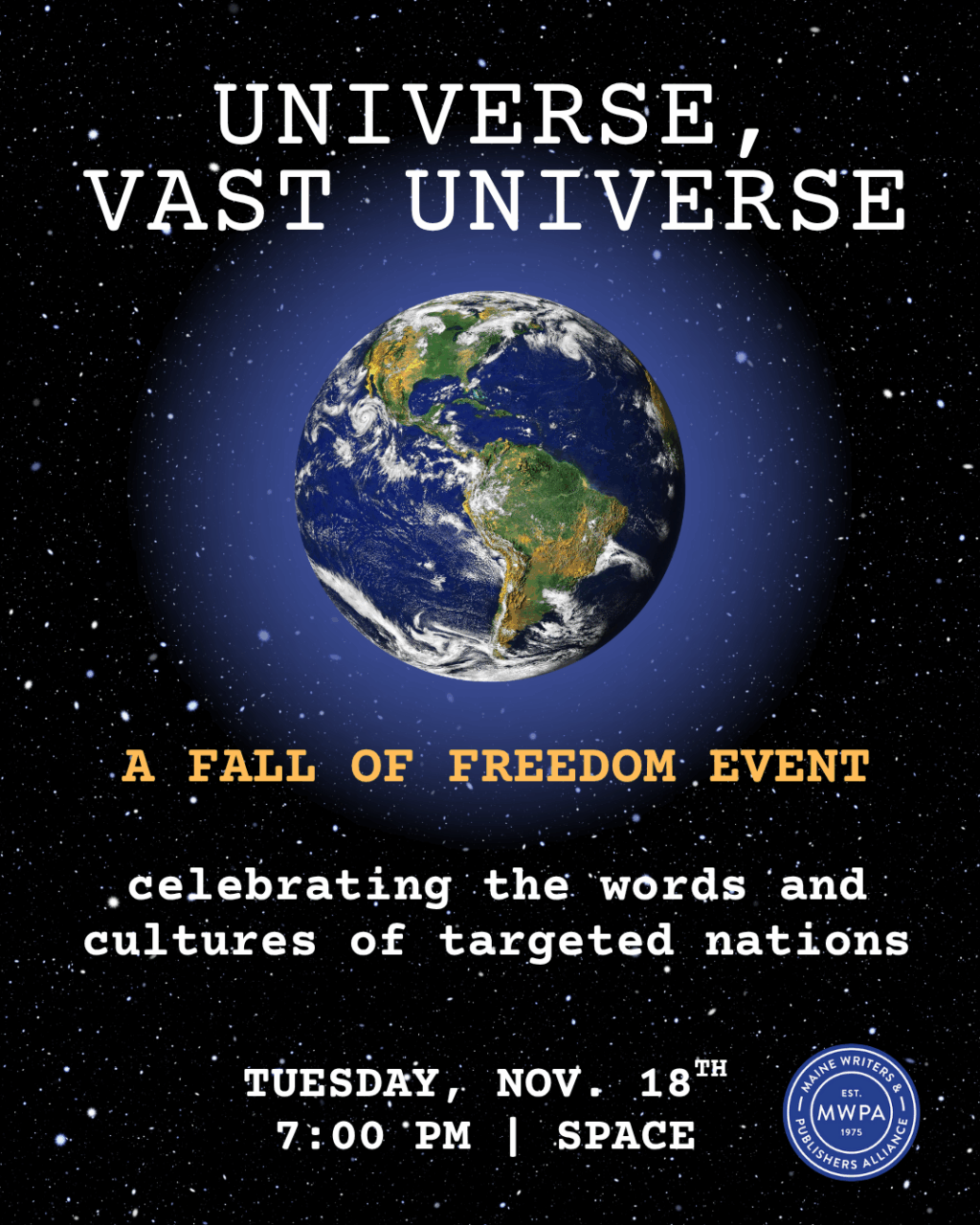 Please join Maine Writers & Publishers Alliance, SPACE, and friends as we flip the script and showcase the vibrant prose, poetry, and culture that has come out of targeted nations, such as Afghanistan, Chad, Democratic Republic of Congo, Equatorial Guinea, Eritrea, Myanmar, Haiti, Iran, Libya, Somalia, Sudan, Yemen, Burundi, Cuba, Laos, Sierra Leone, Togo, Turkmenistan, Venezuela, and Palestine.